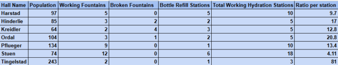 None of Tingelstad’s are broken. The same applies to four out of the seven surveyed halls. Kreidler Hall holds the record for the most amount, with two times as many broken fountains as it has functioning ones. Its water bottle refill stations and a relatively small population keep it from having too high of a ratio of students to hydration stations, though. Kreidler is followed in the broken fountain count by Hinderlie Hall and Ordal Hall.