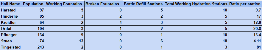 For transparency, not every dorm building was surveyed. South Hall was excluded because it was constructed with personal kitchens in every resident’s room. Additionally, only drinking fountains and water bottle refill stations were counted as “hydration stations.” Any fountain which did not produce water or had water pressure so low that drinking from it became difficult was counted as a broken fountain. The statistics on how many students are currently in each hall came from Dhaval Patel, the Associate Director for Campus Life Operations while Rick Burnley, the Campus Services Manager, provided insight into how various facilities are classified by law.
